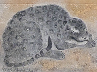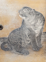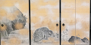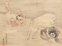 L: 『雪柳狗子図』。 R: 応挙といえばコロコロとした犬。それにしても「応挙といえば○○」がやたらと多い。さてその伊藤若冲と金屏風で競演した作品があり、これが鼻血が出るほど贅沢。応挙は「梅鯉図」で若冲は「竹鶏図」と、