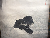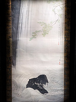 C: 滝の流れを墨の濃淡で表現。 R: 落ちていった先の複雑な流れもまた見事。岩を置くのがセンスだなあと。さて応挙といえば、足のない幽霊である。今回は長沢芦雪、山口素絢とともに並べられていたのだが、応挙はふつうに美人。