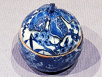 古染付はやや沈んだ色調の青で描かれており、素朴さが残る。初期伊万里(→2023.3.16)の先輩格と言えそうな印象だが、