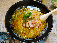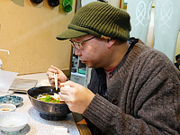 L: 舌鼓を打つバヒさん。 C: 蕎麦だしラーメン。 R: ラーメンをいただくバヒさん。おいしゅうございましたね。その後はバヒさんの部屋でウイスキーの試飲会。僕がサントリー白州蒸溜所の土産で買ったウイスキー(→2025.8.17)を、