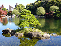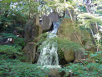 L: 徳川園の園内はこんな感じ。 アスファルト舗装が気に入らない。 C: 大曽根の滝。モミジの葉が邪魔。 R: 芝生広場。