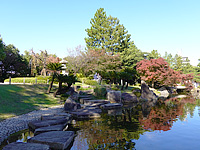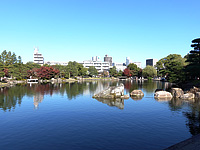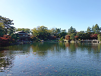 L: 亀島。これは確かに亀だ。 C: 紅葉の具合はまずまず。 R: 大曽根側から見た龍仙湖。左に観仙楼。