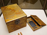 源氏物語蒔絵箔箱。人物を描かず『源氏物語』の場面を表す「留守模様」とのこと。