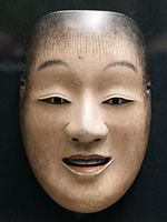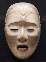 L: 能面 姥。「高砂」では媼の面として用いられる。 R: 能面 慈童。少年の姿を借りた精霊を表した面で、観世流で用いられる。