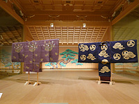 L: 名古屋城二の丸殿付属の能舞台を復元。左は紫地秋草に紫地秋草に蝶文長絹、右は紺地飛雲・巴文金襴袷狩衣。