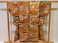 C: 紅地柴垣に桐・秋草文唐織。唐織は色糸や金銀糸を交えて文様を表しており、最も絢爛豪華な能装束とのこと。
