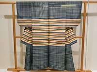 R: 白・納戸細格子と茶・花色・黄・赤・白横縞腰替熨斗目。腰替は腰の辺りで柄の印象が変わるものを指す。名品コレクション展示室の最後は、源氏物語絵巻の企画展に合わせてか、源氏物語関連の特集となっていた。