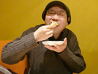 C: 気まぐれ燻製セット。盛大な煙に包まれて登場。 R: ピザを頬張るバヒさん。燻製だけだと主食系が弱いのでこれは助かった。なんだかんだでそれなりに食ったので、2軒目はバヒさんに連れられてバーへ。入ったら店内はほぼ真っ暗でびっくり。