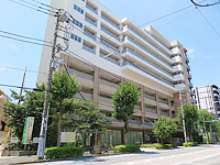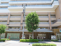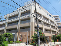 L: 平塚橋ゆうゆうプラザ。特別養護老人ホームを併設している。 C: 正面から見たところ。 R: エントランス付近。