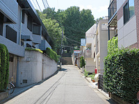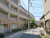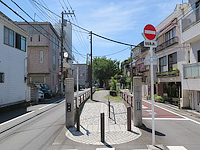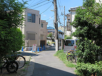 L: 北から眺めたところ。高層部は区営西中延住宅となっている。 C: 北西側。やはり住宅密集地帯で道が狭い。 R: 北西端。