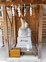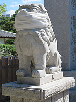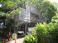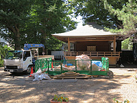 C: 社殿が改修工事中なのであった。こちらの仮拝殿でお参り。 R: 少し左に寄ってみる。これはあらためて参拝しなければ。