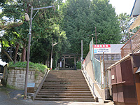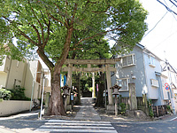 L: 少し離れて境内の端に神楽殿。 C: 境内から東を見るとこの景色。往時は絶景だったに違いない。 R: 西側の裏参道。小山八幡神社の西側は洗足田園都市である。日本における田園都市構想といえば何といっても田園調布が有名だが、