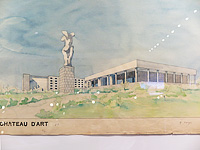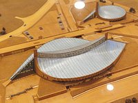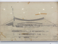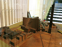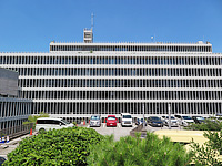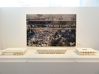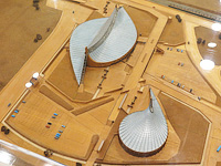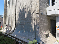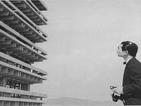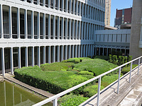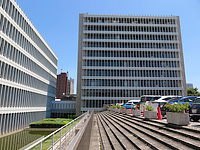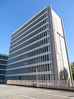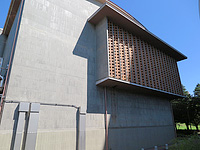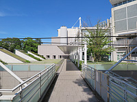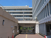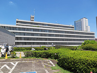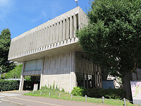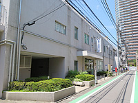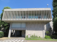L: 南西から見た荏原文化センター。東西に異様に長く、住宅稠密地域なので、凄まじく全体像をつかみづらい。