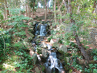 L: 大崎高校に続く園内の南西側が高くなっている。 C: 滝がいい感じである。 R: 付近住民の憩いの場なのだなあ。さらに北西へ行くと戸越八幡神社である。1526(大永6)年、村の水源に現れた誉田別命の御神体を行永法師が持ち帰り、