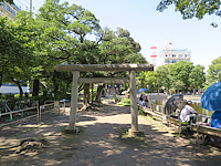 L: 三谷八幡神社の入口。見てのとおり非常にコンパクトな神社だが、1929年の区画整理の影響でそうなったらしい。