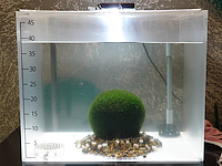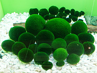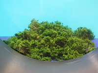 L: 石段を上りきると神楽殿(拝殿)。 C: 手水鉢の底にはさまざまな色のガラス玉があってきれい。苔も見事である。