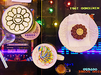 L: ドンキーコングに興味津々なマサル。 C: 注文した品が到着。村上隆の「お花」がフィーチャーされている。