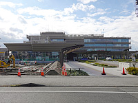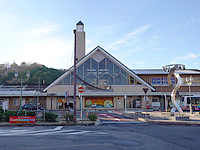 C: 樽見駅のモニュメント。 R: 駅舎は「C」の字をした「うすずみふれあいプラザ」として整備されている。