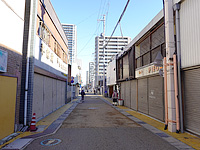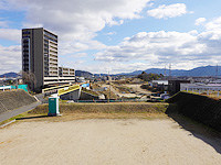 L: こちらが旧草津川の堤防に上がる坂。 C: 坂を上って振り返る。逆光の中、複数の建物があるのが見える。