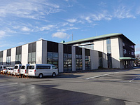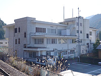 L: 本巣市役所根尾分庁舎(旧根尾村役場)。 C: 駐車場越しに正面から見たところ。 R: 樽見駅のホームから見た背面。やってきた列車に乗り込んで、1駅だけ揺られる。水鳥(みどり)駅で下車したのは僕だけなのであった。