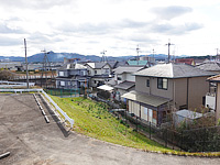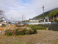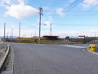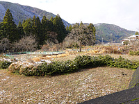 L: 南西から眺める。右が2つの高さに分かれているが、上の水平が後から盛られた部分(畑)で、下の坂が県道である。