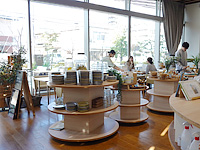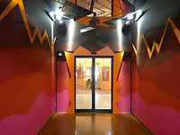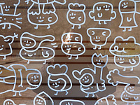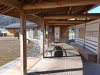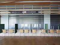 L: うすずみふれあいプラザ内。 C: 待合スペース。 R: 窓ガラスに描かれている謎の生物たち。この辺りはかつて根尾村で、2004年に合併して現在は本巣市の一部である。3町1村の合併で根尾村が唯一の村だったが、