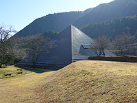 R: さらに坂を上って断層上段から県道の下段方向(南)を振り返る。これだと断層らしさはなくて、サッパリわからんなあ。ひととおり撮影を終えると、地震断層観察館・体験館を見学する。観察館は地震資料館と地下観察館に分かれており、