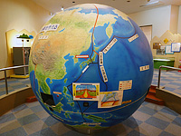 R: 中央にはプレートで分けられた巨大な地球儀。日本は4つのプレートがひしめく、世界的に見てもとんでもない場所にある。
