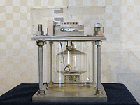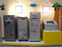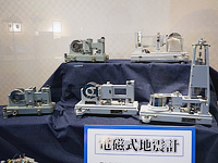 L: 各種の電磁式地震計。 C: こちらも地震計。 R: 水管傾斜計。地盤の傾きをフロートの位置変化によって測定する。さて地震断層観察館は南の円柱状の建物が地震資料館なのに対し、北のピラミッド状の建物が地下観察館である。