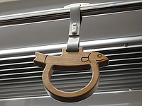 L: 樽見鉄道の標準的な車両はこのタイプと思われる。 C: 車両と駅名標のデザインが一緒。 R: 吊り革の握り部が鮎だった。