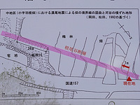L: 国道157号沿いのこちらが現場。 C: 説明板の図をクローズアップしてみた。 R: 同様に説明板の写真をクローズアップ。根尾谷断層が発生したのは、1891(明治24)年の濃尾地震である。今から130年以上も前のできごとなのだが、
