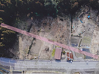 L: 下段からできるだけ断層に近づいてみる。ここは往時のままだ。 C: 県道の坂道、途中から下段側(南)を見下ろす。