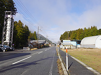 L: 県道255号。ここが断層の現場である。左に看板がある。 C: 右(北東方向)を見る。右側は後から石が積まれている。